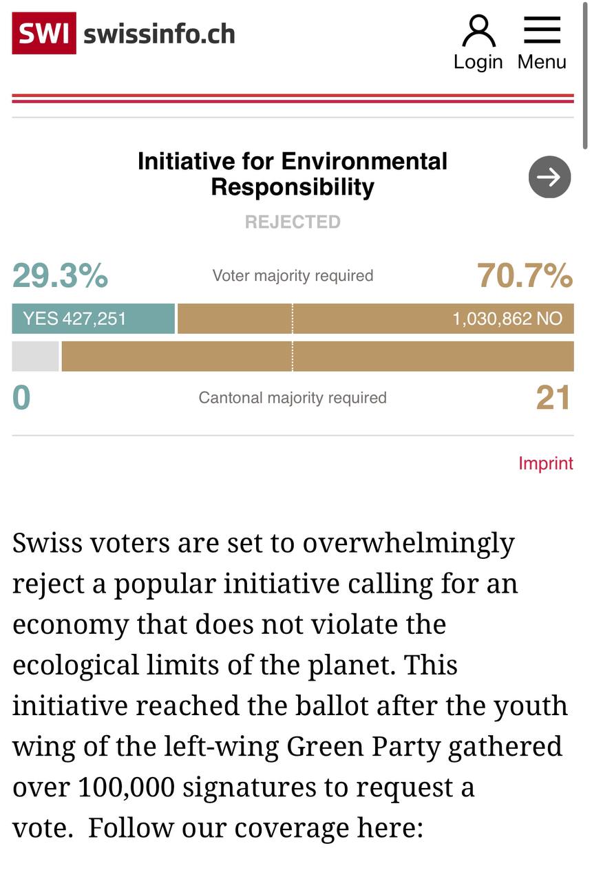 На референдумі у Щвейцарії громадяни абсолютною більшістю відхили пропозицію зелених під назвою «Environmental Responsibility Initiative», яка внесення в конституцію статті, яка б обмежувала економічну діяльність туманним формулюванням «в межах здатності природи до відновлення». Використання ресурсів мало б бути обмеженим до рівня, «який би не шкодив екосистемі».