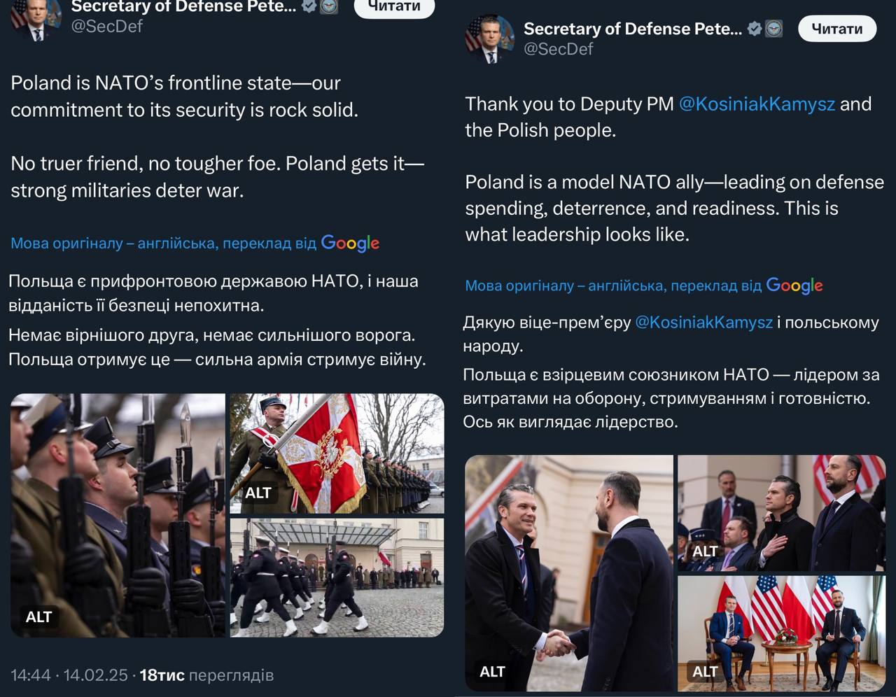 Піт Хегсет назвав Польщу «рольовою моделлю для інших країн НАТО» і лідером Європи, в також підтвердив непохитність відданості її безпеці.