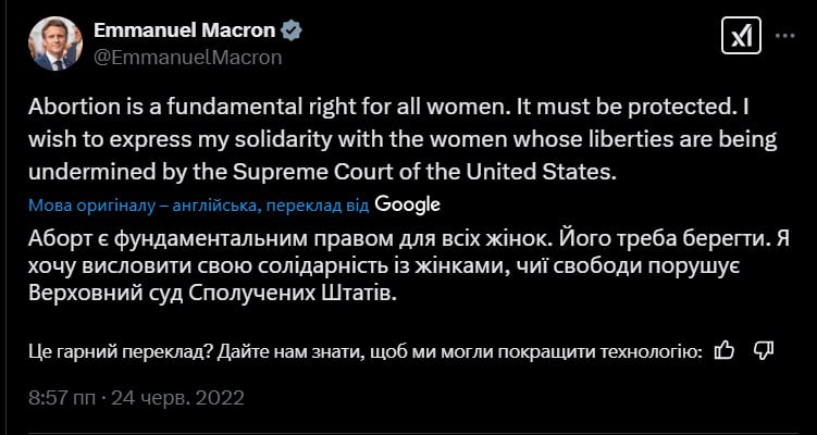 Наприклад ось Макрон якогось дідька коментував рішення Верховного суду щодо абортів. Такого обурення тоді не було, хоча точно не Макрону варто було б повчати, що приймати судам в Штатах.