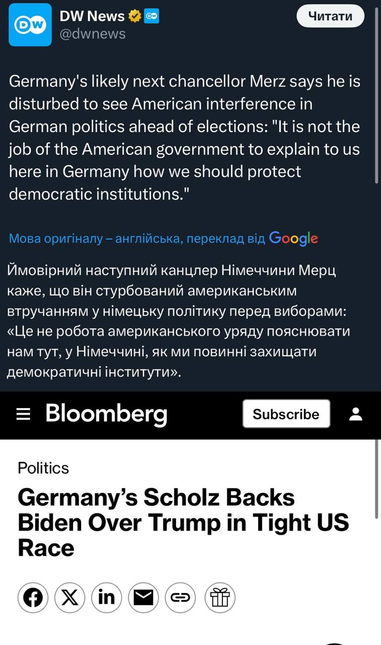 Я згоден з Фрідріхом Мерцем. Джей Ді Венс не мав втручатись у німецькі вибори, так само як Олаф Щольц не мав втручатись у американські. Будемо сподіватись ця практика піде разом з Олафом Шольцем в минуле 😂