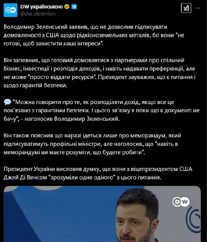 Тут я згоден із Зеленським. Як там було: ми ж не можемо давати вам ресурси, бо ви хороші хлопці. Для цього потрібні реальні гарантії. Китай вже почав видобувати на окупованих територіях, тому задля того, щоб отримати доступ до тих, що ми контролюємо товарищам Трампу, Рубіо, Бессенту, Хегсету доведеться трохи порухати булками в наших інтересах