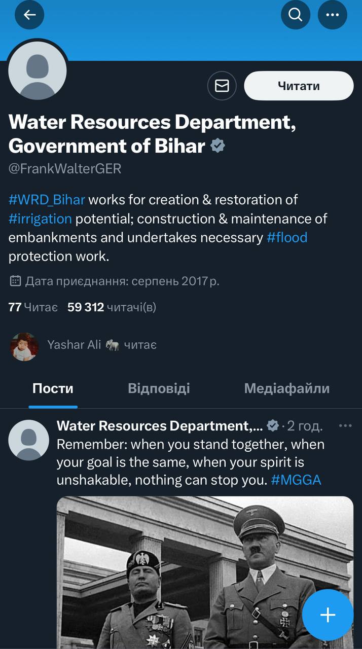 Офіційно підтверджений аккаунт Адольфа Гітлера перейменувалася в у Департамент водних ресурсів штату Біхар (Індія).