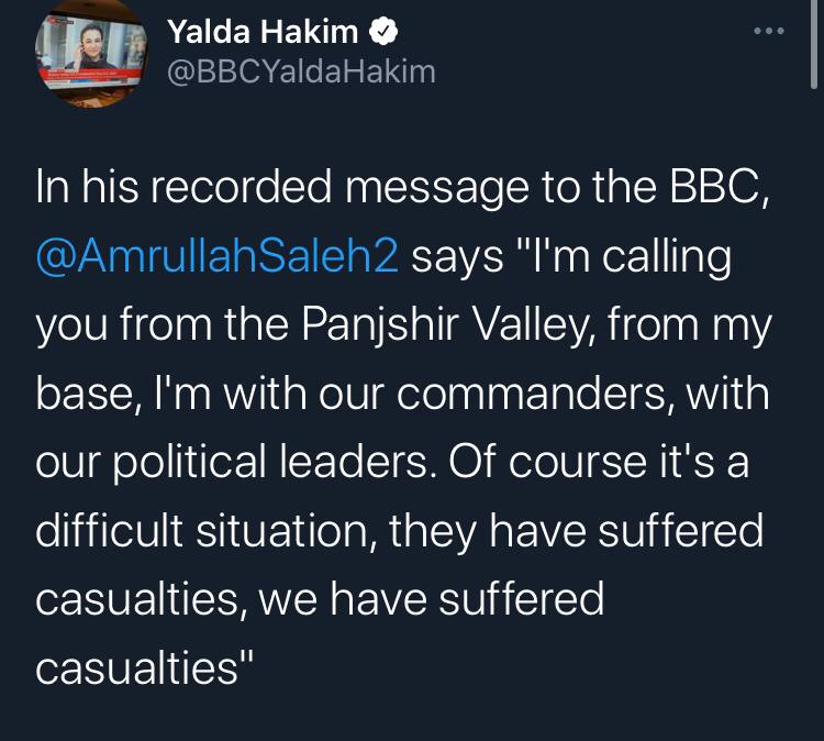 В.о. президента Афганістану Амрулла Салех у записаному повідомленні, яке надіслав BBC, спростував захоплення Панджшеру та спростував чутки про свою втечу в Таджикістан