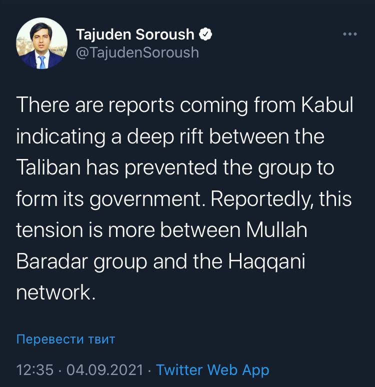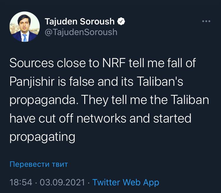 Таюден Суруш з посиланням на свої джерела спростовує взяття Панджшеру. Кажуть, що таліби відрізали Інтернет і запускають фейки, тому що панджшерське ополчення не може їх спростувати.