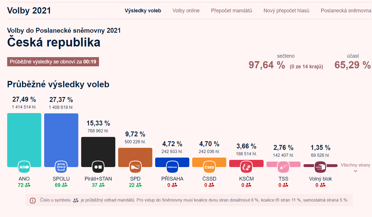 По результатам підрахунку 90,48% голосів в парламент Чехії проходять чотири партії: партія діючого прем'єра ANO, правоцентристський блок "Spolu" ("Разом"), блок "Пірати та мери" (альянс Партії піратів (тут все зрозуміло, думаю) та Партії мерів (боряться за права місцевого самоврядування) та партія "Свобода та пряма демократія" мого улюбленного справжнього чеха і самурая Томіо Окамури. Партія діючого прем'єра Бабіша поки що здобуває перемогу.