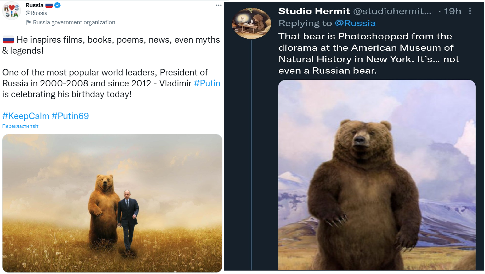 Офіційний твіттер-канал Росії запостив крінжову картинку Путіна з ведмедем (а чому не з Шойгу?) на день народження Хуйла.