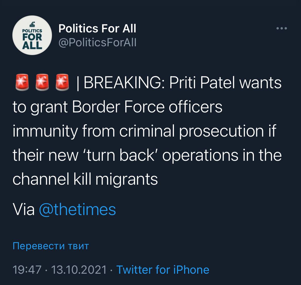 Міністр внутрішніх справ Великобританії Пріті Пател планує надати співробітникам берегової охорони імунітет від кримінального переслідування за випадки, коли їхні дії по недопущенню мігрантів призводять до смерті мігрантів.