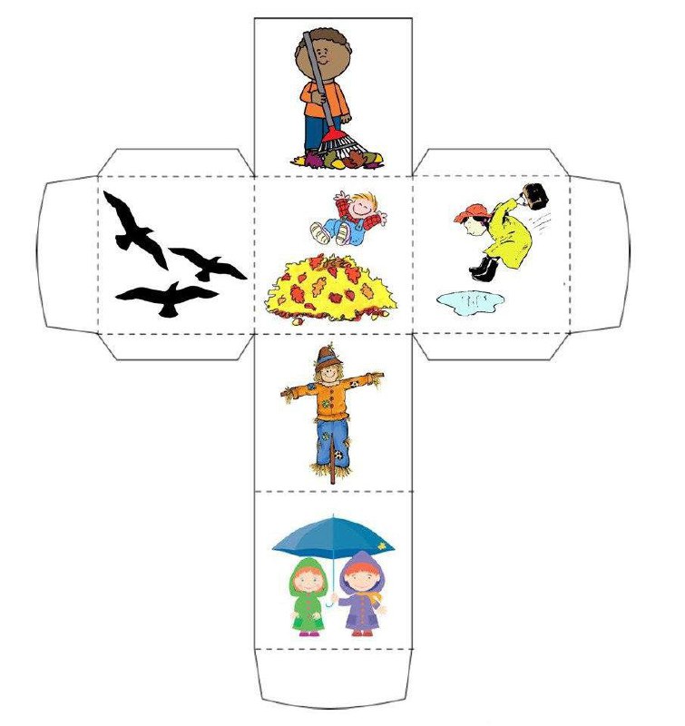 Бросаем по очереди кубик. Когда выпадает одна из граней, игрок должен выполнить задание, которое на нем нарисовано. Играть вы можете как на прогулке в естественной ситуации, так и