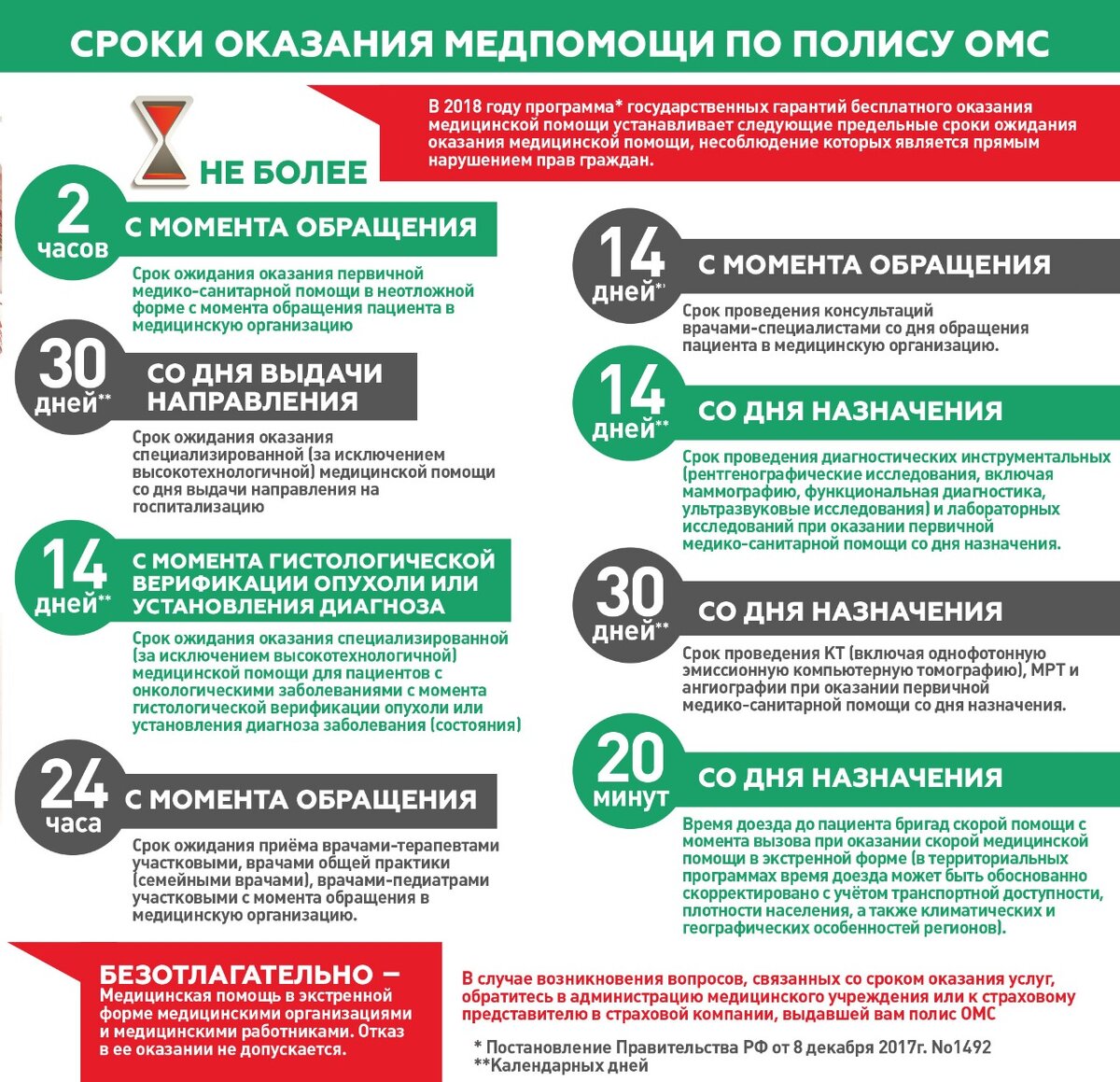 ОДНАКО друзья, обращаясь за медицинской помощью по программе ОМС, помните, что по закону, она должна предоставляться в строго отведенные сроки. Они регламентируются Программой государственных гарантий, которую каждый год утверждает Правительство РФ, и вы уверенно можете на нее ссылаться при защите своих прав, вот некоторые из них: