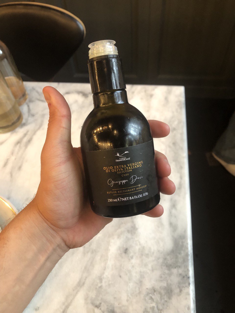 Шеф уехал и оставил нам два вида оливкового масла, одно из которых – коллаборация Джузеппе Дави и его ресторана Butler с известным итальянским производителем оливкового масла TERRE FRANCESCANE. На маслопресс оливки поступают из нескольких оливковых рощ, и в начале 2013 года бренд запустил новую фирменную линейку с итальянским знаменитым шеф-поваром Бруно Барбьери, получившим 7 звезд Мишлен за 35 лет работы, и именно в рамках этой линейки и родилось масло от Джузеппе Дави. И теперь в Hidden можно попробовать это масло.
