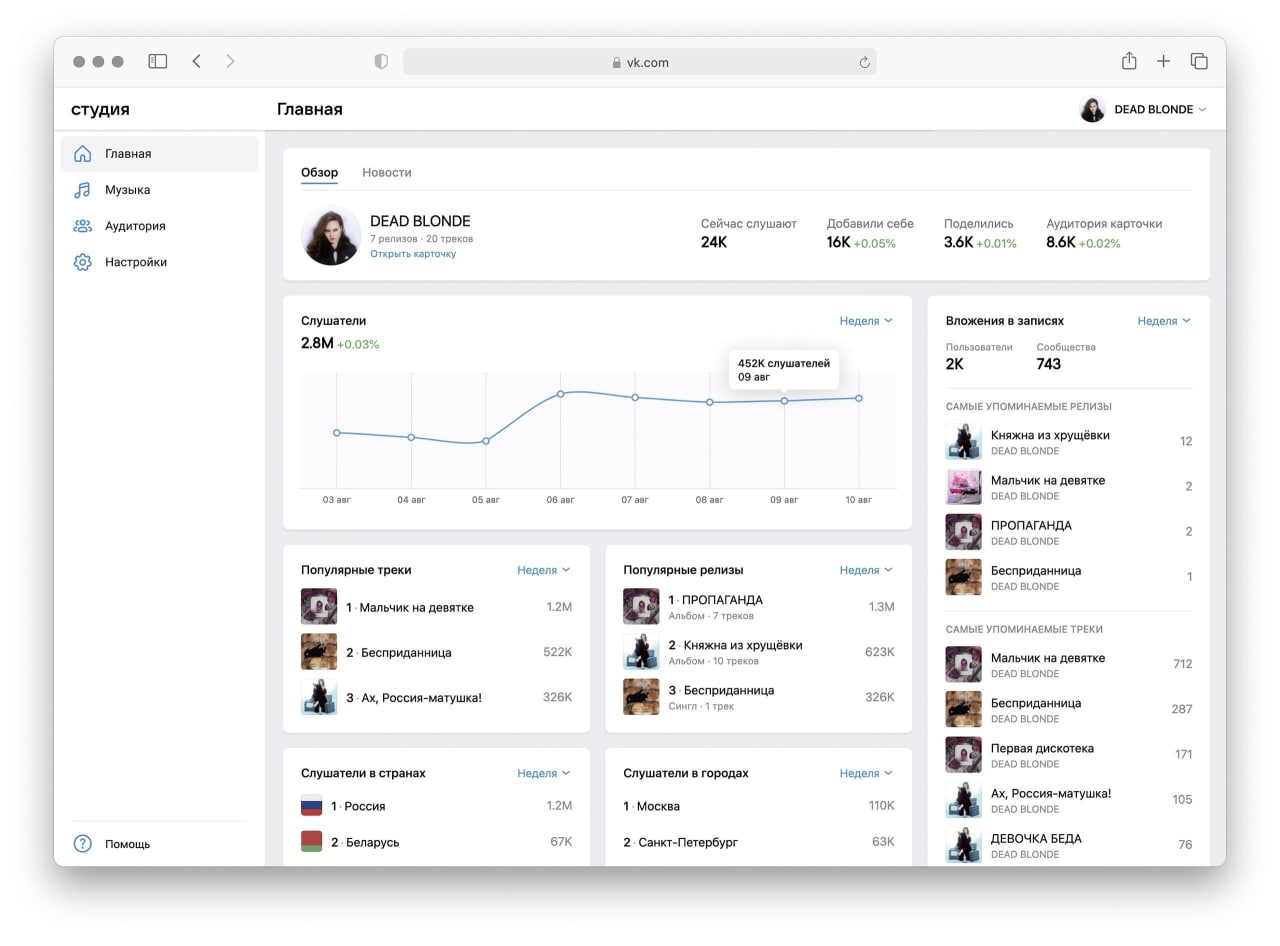 🎹🎤 «ВКонтакте» запустила кабинет для музыкантов с историей прослушиваний и портретом аудитории