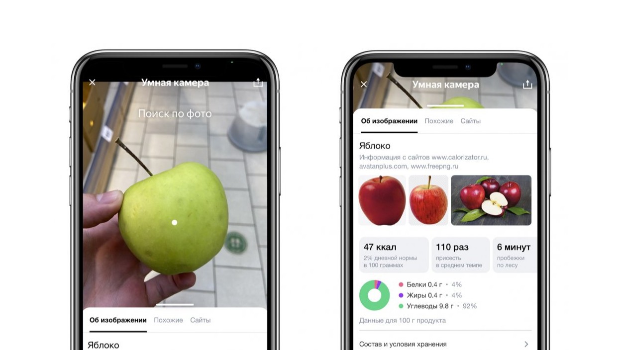 Улучшенная камера даёт подробное описание продуктов при их поиске в интернете. При наведении на продукт она покажет количество жиров, белков и углеводов, наличие сахара и ГМО, содержание микроэлементов и калорий, а также, как долго нужно плыть или бежать, чтобы их израсходовать.