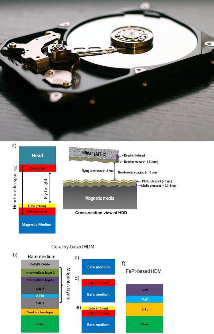 Основными компонентами жёсткого диска являются пластины и магнитная головка, используемая для записи и чтения данных. Для обеспечения более высокой плотности записи пространство между пластинами и читающими головками постоянно уменьшается, и в настоящее время большую часть таких промежутков занимает углеродное покрытие, предназначенное для защиты пластин от механических повреждений и коррозии. Плотность записи данных на жёсткие диски с 1990 года выросла в четыре раза, до 1 Тбит/дюйм² (до 2 Тбит/дюйм² при использовании HAMR), а толщина защитного покрытия на пластинах уменьшилась с 12,5 нм до примерно 3 нм.