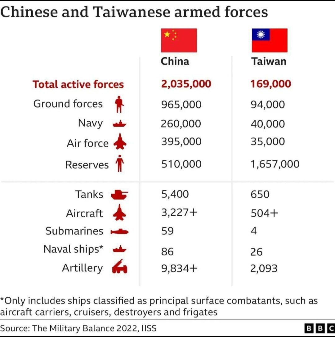 Недавно нам попалась простая инфографика, которая показывает тотальное превосходство армии КНР над армией Тайваня. Соотношение должно говорить о простоте военной операции, но это совсем не так: