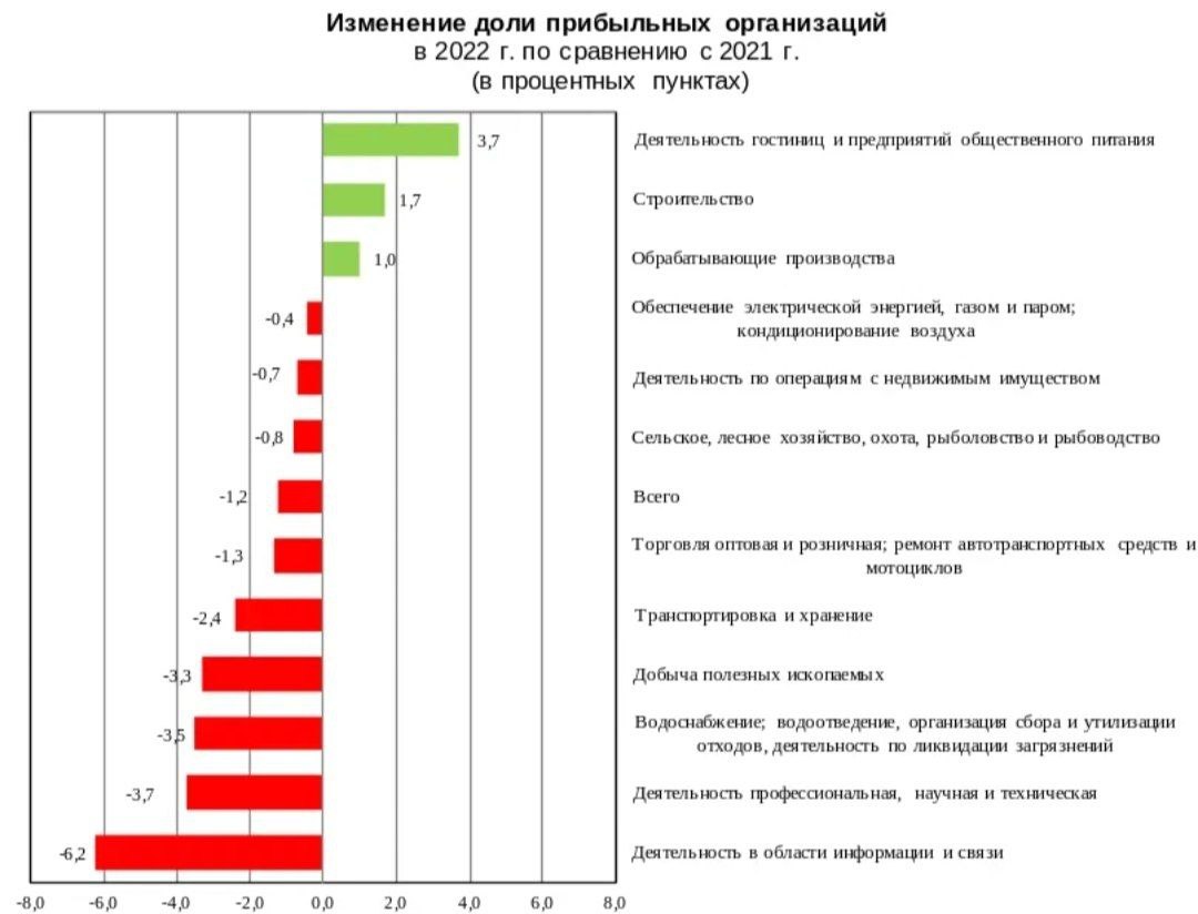 - Выросла доля прибыльных организаций в отраслях: "Строительство", "Обрабатывающие производства", "Деятельность гостиниц и предприятий общественного питания", это коррелирует с общим трендом импортозамещения