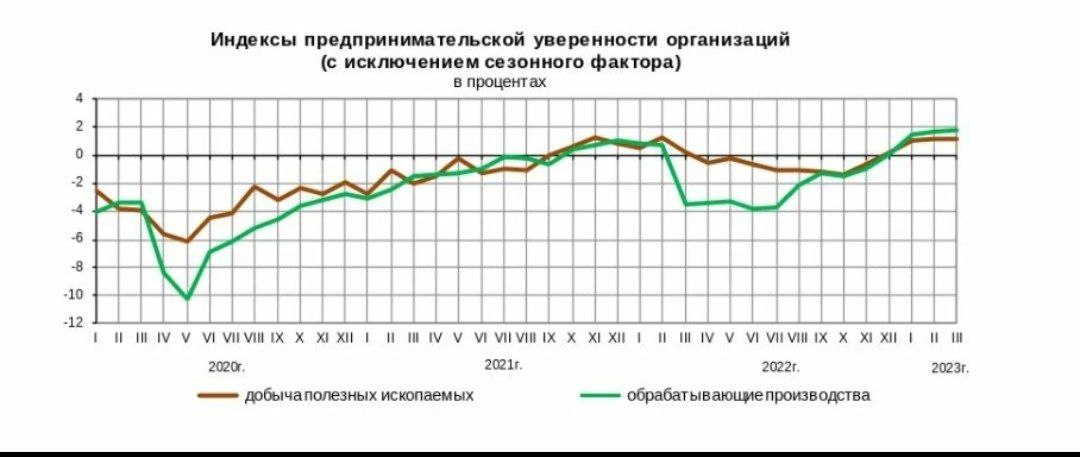 - Наибольший уровень предпринимательской уверенности как со стороны обрабатывающей промышленности, так и со стороны добычи за 2020-2023 гг.