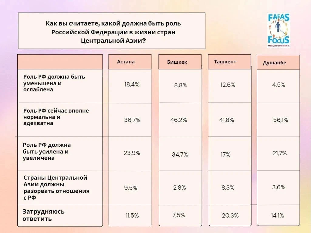 - Средняя Азия, несмотря на попытки представить обратное, является устойчивым союзником России. К примеру, по недавнему опросу в приложении видно, что рядовые граждане среднеазиатских республик позитивно относятся к влиянию России на регион и многие хотели бы расширения влияния (от 17% до 35%) - это говорит о том, что путь к суверенному развитию региона в углублении экономического и политического взаимодействия (ЕАЭС и ОДКБ)