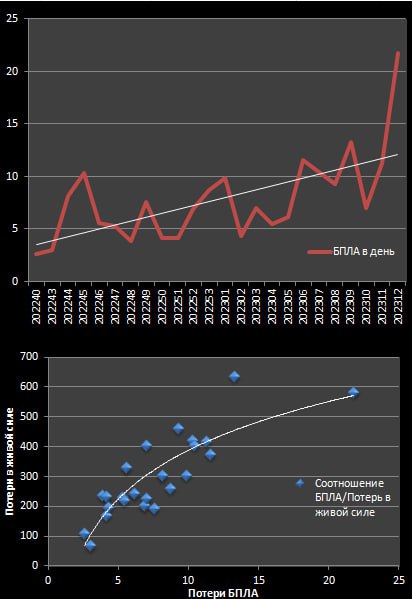- Резкий рост использования БПЛА ВСУ. Потери БПЛА на текущей неделе составляют 23 шт. в день против 10 шт. на прошлой неделе и 7 шт. в среднем за предыдущие три месяца. Это уже промышленная раскатка того, чего все ждали: расширение беспилотной войны и полностью соответствует постоянному росту вооруженности БПЛА (позитивный тренд на графике), росту интенсивности (корреляция потерь ВСУ и БПЛА составляет 0.88)
