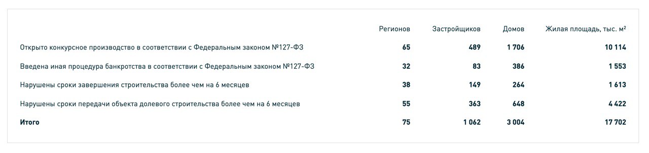 В Едином реестре проблемных объектов, который ведет ДОМ РФ, сейчас числится 3004 тыс. домов из 75 регионов России. Из них, по словам руководителя Минстроя РФ Владимира Якушева, 1 тысяча менее проблемная, вопрос «легко решаемый».