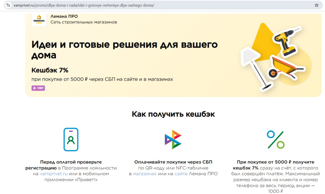 Банковский кэшбэк за покупки по СБП может быть у карты "Пэй" от "Яндекс Банка" (в "Лемана ПРО" при этом способе оплаты выдается МСС 5300) и у "МКБ" (но не более чем с трат в 10 000 руб./мес.).