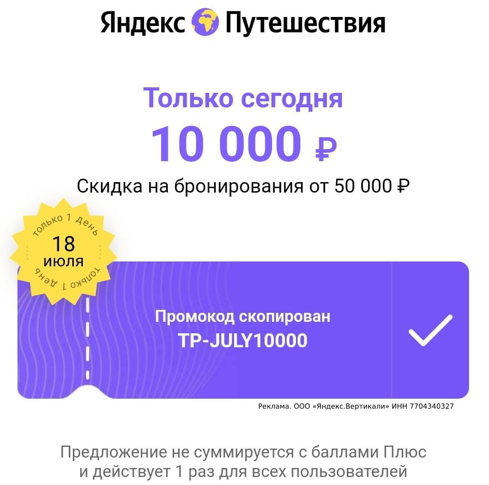 TP-JULY10000 — скидка 10 000 ₽ для всех при бронировании отеля от 50 000 ₽, действует по ссылке 18.07.25.✈️ Яндекс Путешествия (другие промики, которые действуют более длительное время)