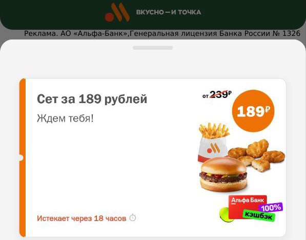▶️ 100% кэшбэка во "Вкусно — и Точка" за один "Сет" (стоит сегодня 189 руб.).