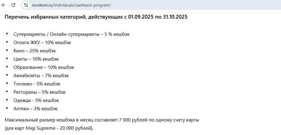 На сайте "Новикомбанка" появились документы с доступными для выбора повышенными категориями кэшбэка и МСС-кодами на сентябрь и октябрь.