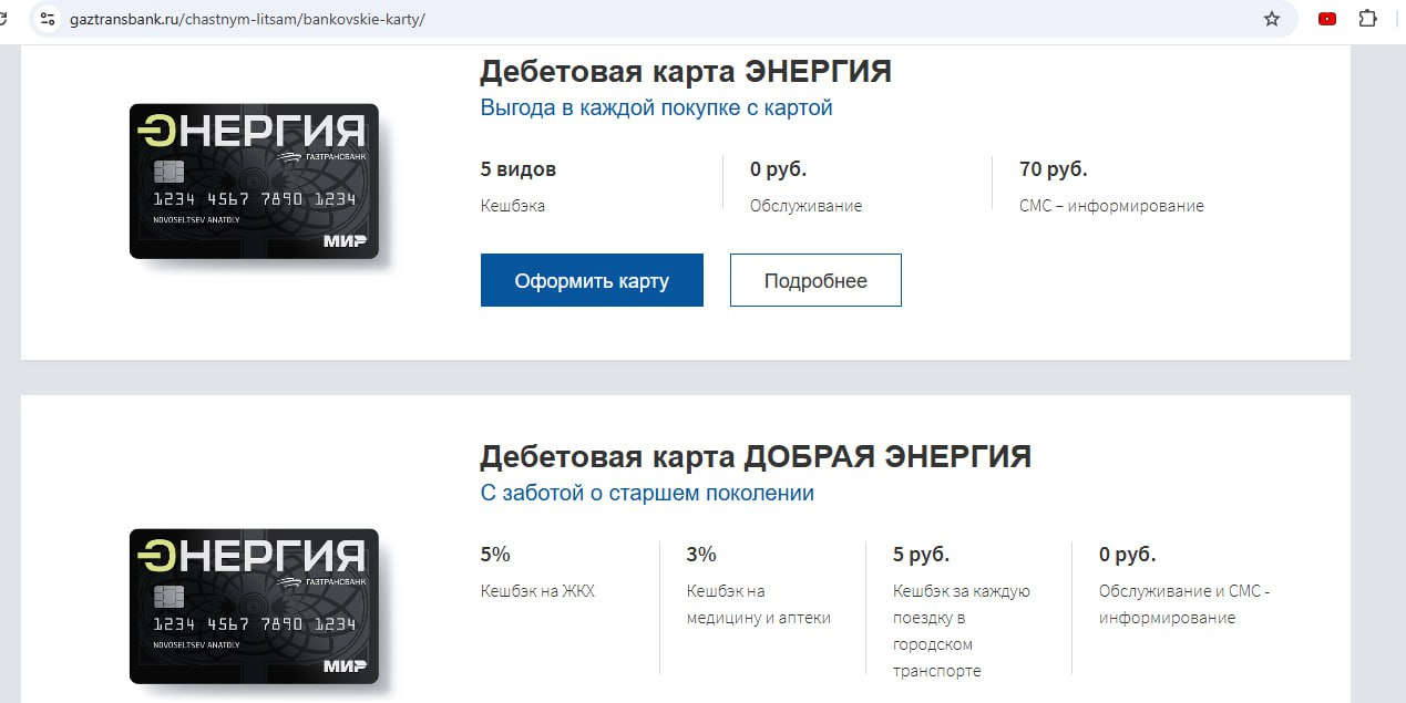 Кэшбэк 5% за ЖКХ по карте "Энергия" и "Добрая Энергия" от "Газтрансбанка".