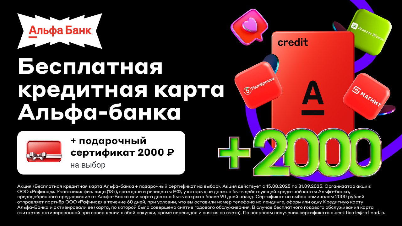 Если заказать кредитную карту "60 дней без%" от "Альфа-Банка" по этой ссылке до 30.09.25 и сделать минимум 1 покупку, то в подарок будет положен сертификат на 2000 руб. на выбор в Золотое Яблоко/Пятёрочку/Магнит.