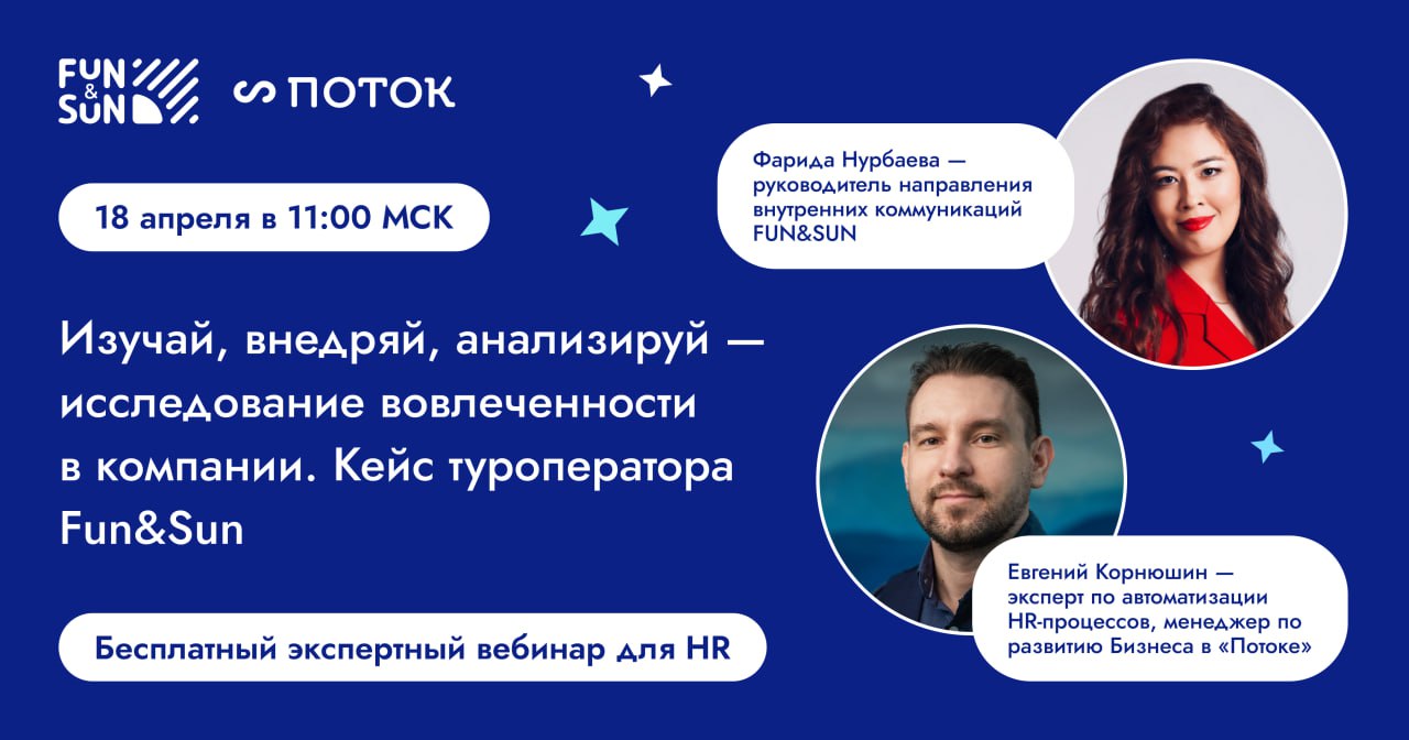 Эксперты «Потока» совместно с коллегами компании «FUN&SUN» разберут практический кейс, чтобы показать вам, как правильно оценить и повысить вовлеченность команды.