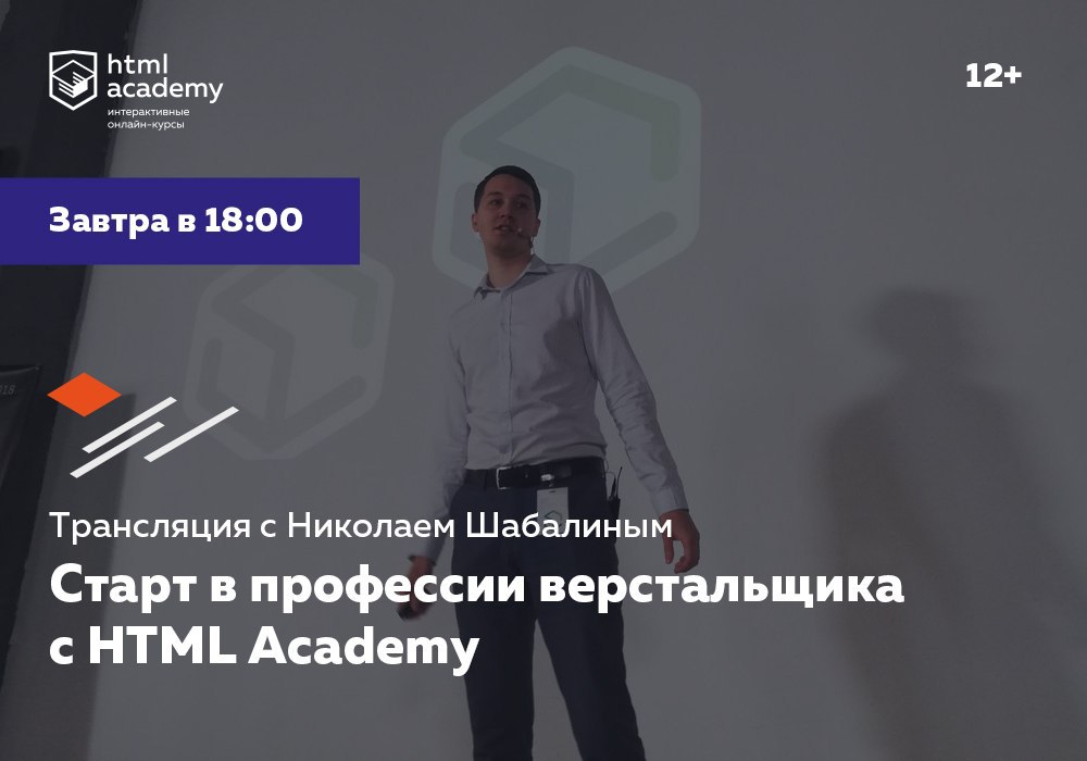 Завтра в 18:00 по московскому времени Николай Шабалин, автор и преподаватель курса «HTML и CSS, уровень 1», в прямом эфире расскажет про обучение в HTML Academy.