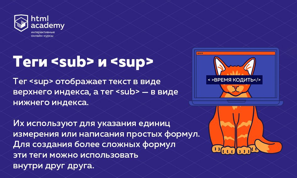 Нижний и верхний индексы размечаются тегами <sub> и <sup>. Например, H₂O будет выглядеть так: H<sub>2</sub>O.