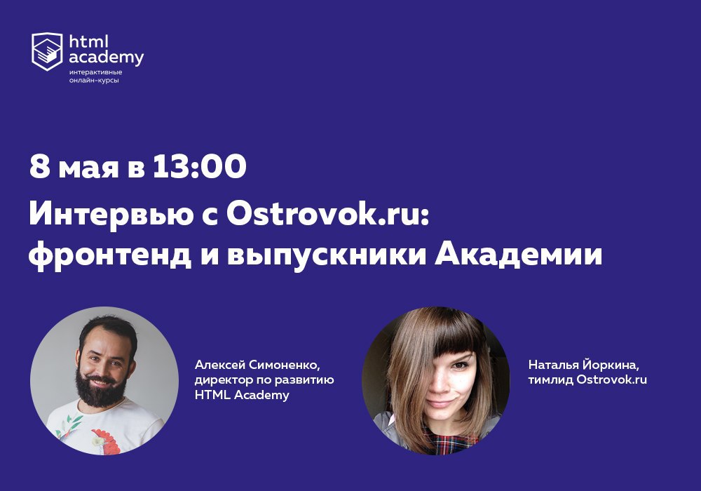 Лёша Симоненко, директор по развитию HTML Academy, и Наталья Ёркина, тимлид Ostrovok.ru, уже в эфире — подключайтесь.