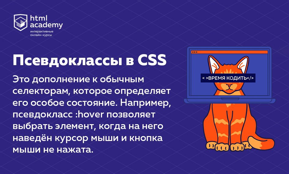 Псевдоклассы — это дополнения к обычным селекторам, которые позволяют стилизовать элемент на основе его положения в документе или действий пользователя.
