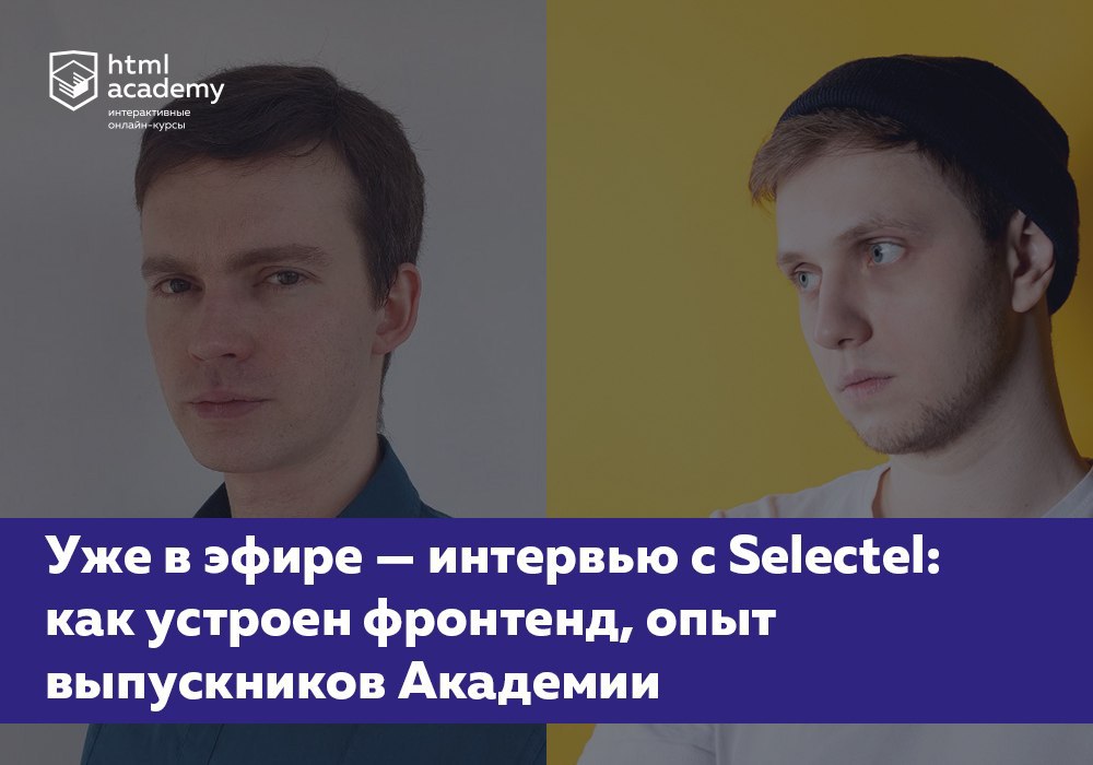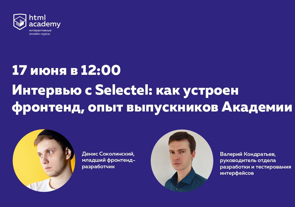 17 июня в 12:00 по московскому времени в прямом эфире встретимся с сотрудниками компании Selectel: Валерием Кондратьевым, руководителем отдела разработки и тестирования интерфейсов, и Денисом Соколинским, младшим фронтенд-разработчиком.