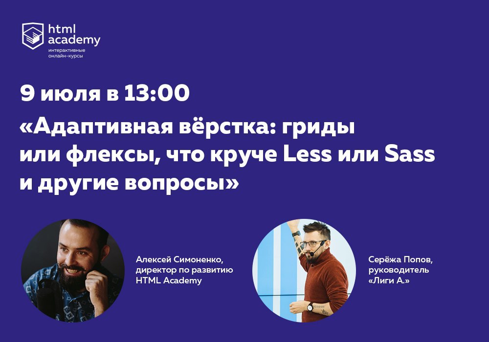 9 июля в 13:00 в прямом эфире поговорим о продвинутых инструментах верстальщика: адаптивная или резиновая вёрстка, флексы или гриды? Less или Sass? Что это всё такое и зачем?