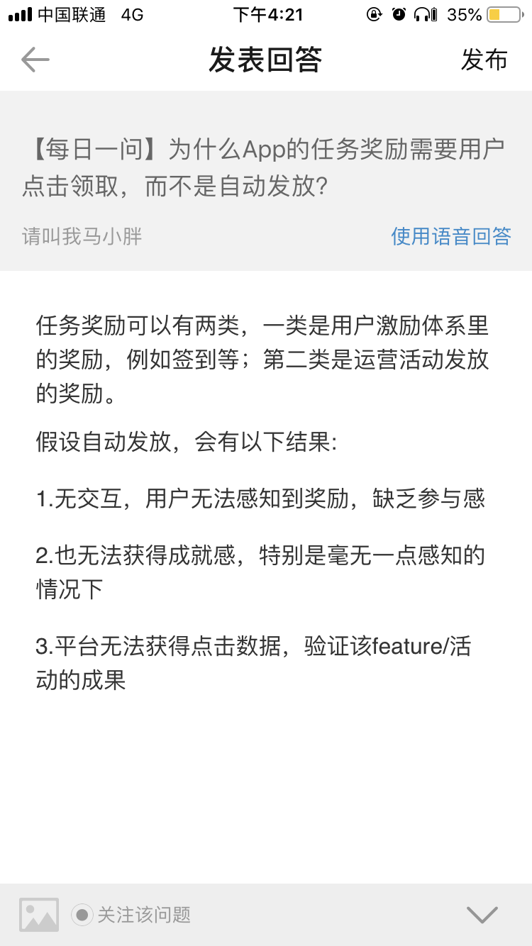5.还有人提到风险控制,但其实这个很微小吧。奖励又可以再分为实物奖励和虚拟奖励,有的平台可能可以做到纯自动发放,但大多还是需要运营人员再二次审核。比如说,实物的总得拿到用户信息审核一下再寄吧,虚拟的总得获取uid再后台发放吧。只能说平台可以有机会甩锅,“我们的机制是需要用户自己领的啊,但是你没领,视为自动放弃”
