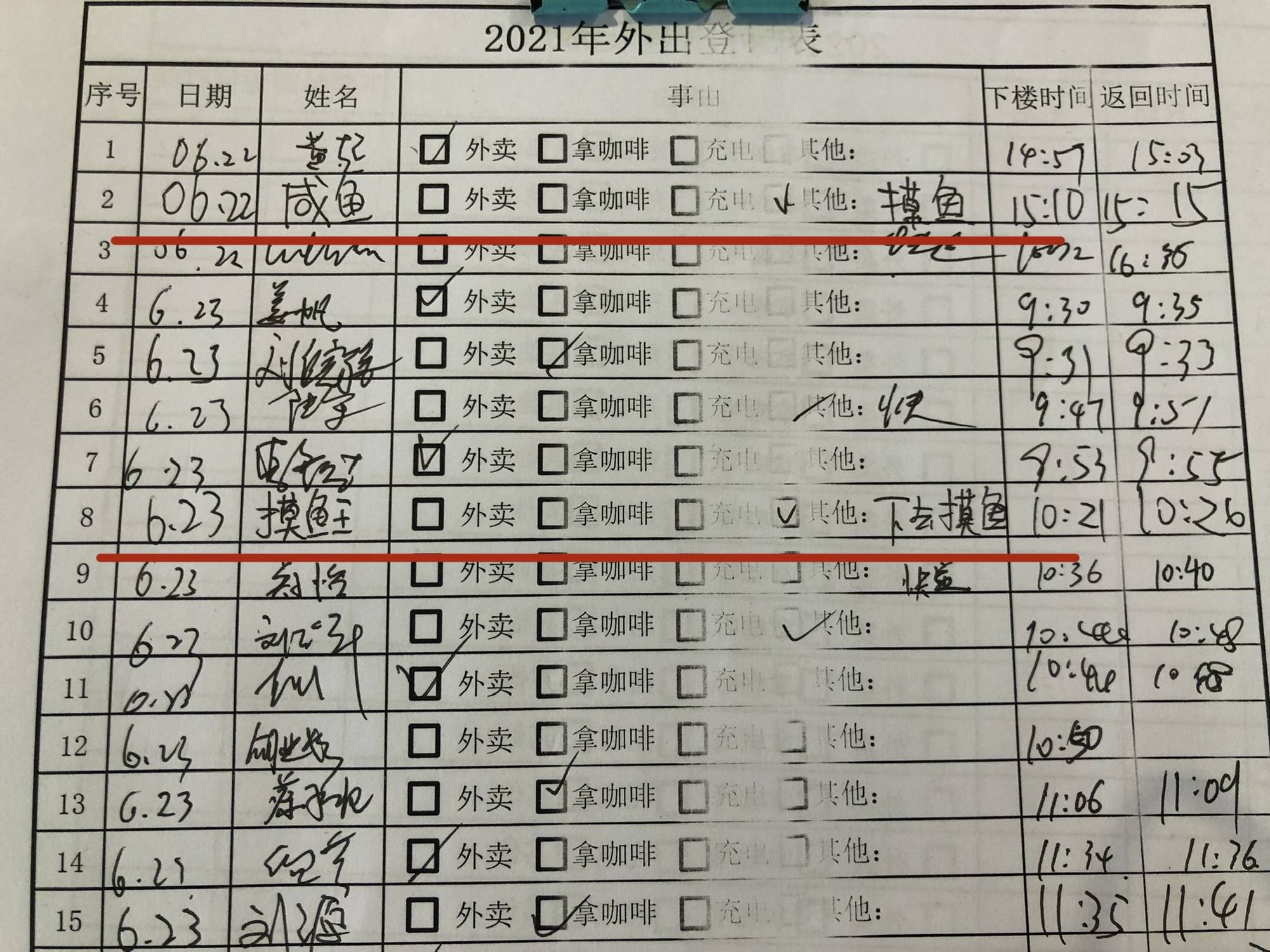 公司规定,在上班时间,下楼干点啥都要写原因,时间。
