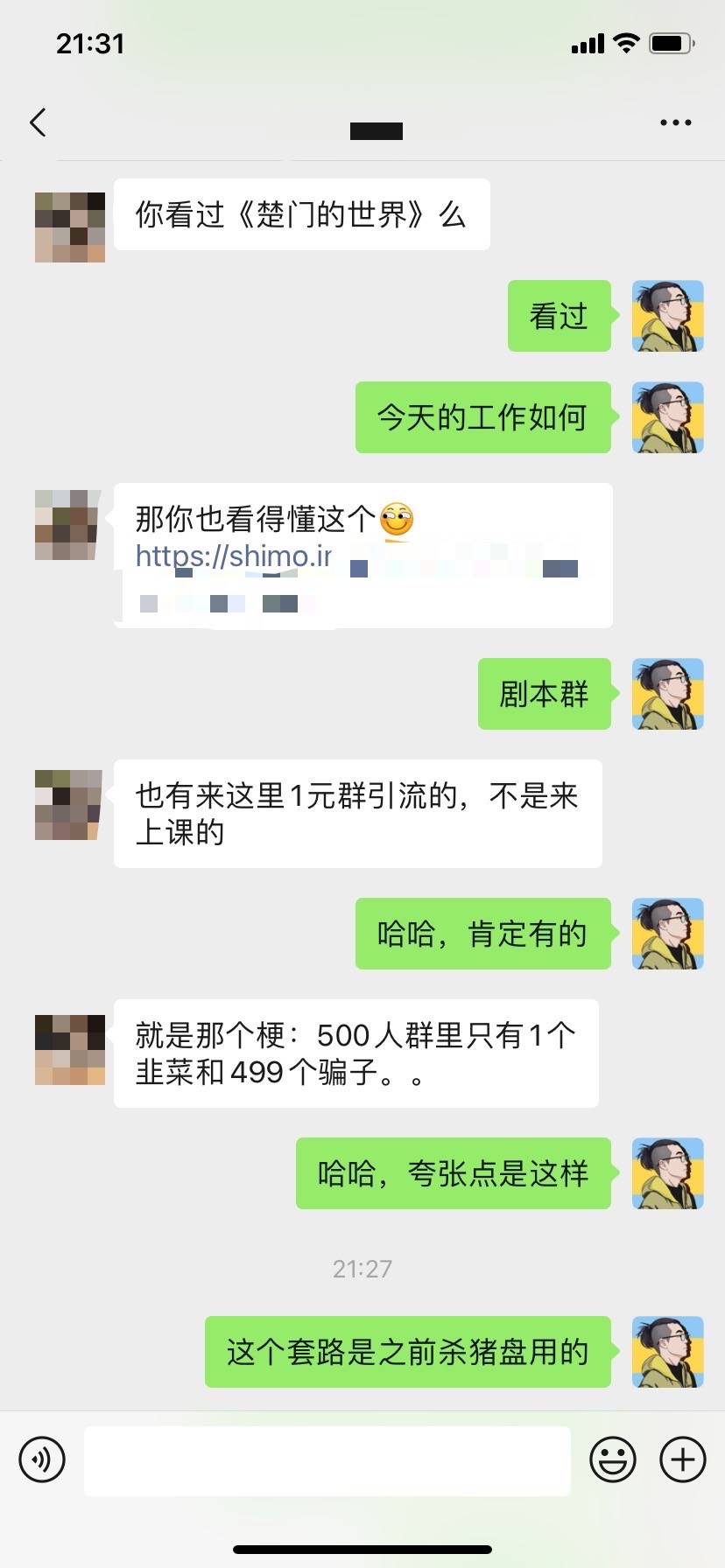然后他说这个剧本群让他想起了那个梗:一个群里499个骗子,1个真人。同时,他的这句话又让我想起了杀猪盘,他们不就是这么做的嘛?所谓的剧本群,只不过是骗得程度浅一点而已。