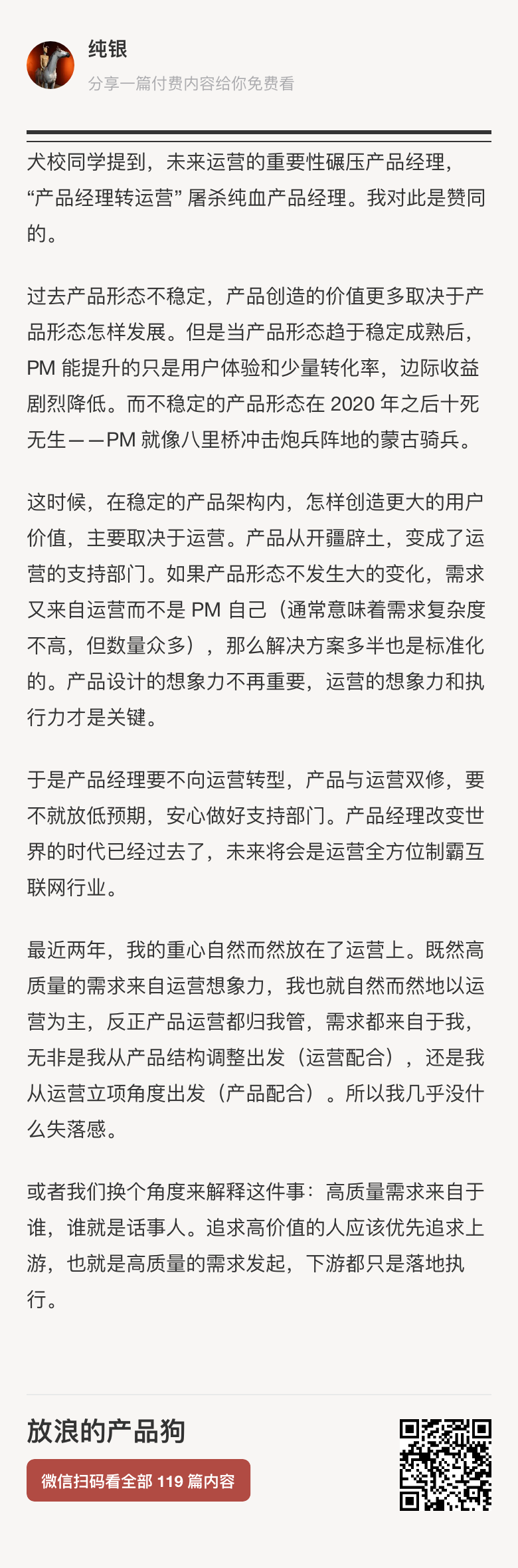 犬校同学提到,未来运营的重要性碾压产品经理,“产品经理转运营” 屠杀纯血产品经理。产品从开疆辟土,变成了运营的支持部门。毕竟高质量需求来自于谁,谁就是话事人。