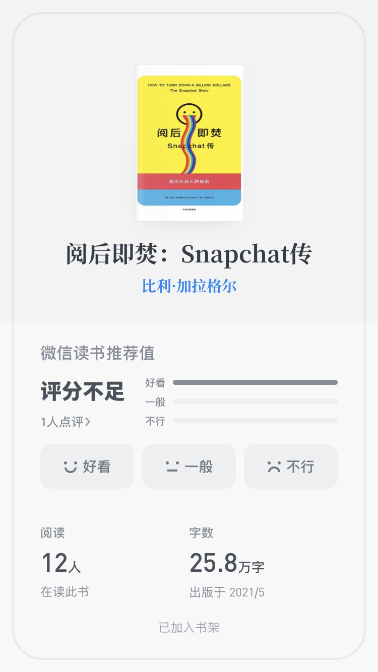 Snapchat的传记书How to Turn Down a Billion Dollars出了译本,《阅后即焚:Snapchat传》,微信读书有上架