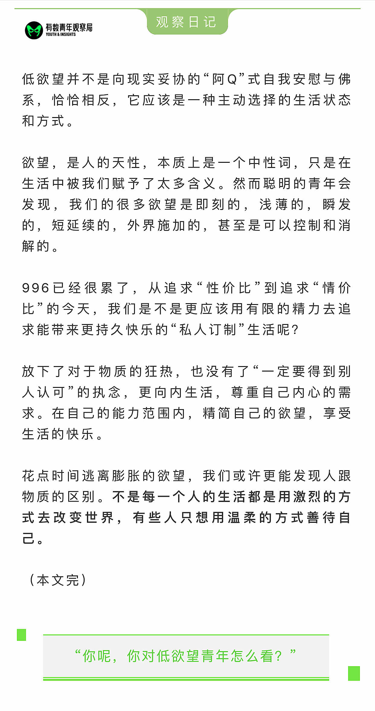 低欲望,不是向现实妥协,而是开始更有感触地热爱生活。毕竟能接受自己是个普通人,从“成功学”的模板逃出来,已经是件了不起的事。