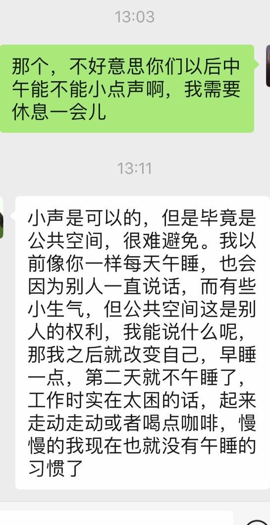 午休时间,旁边一个同事每天哇哇的扯着嗓子聊天,然后今天我发微信她能不能以后小点声,然后???这是什么神奇的言论啊