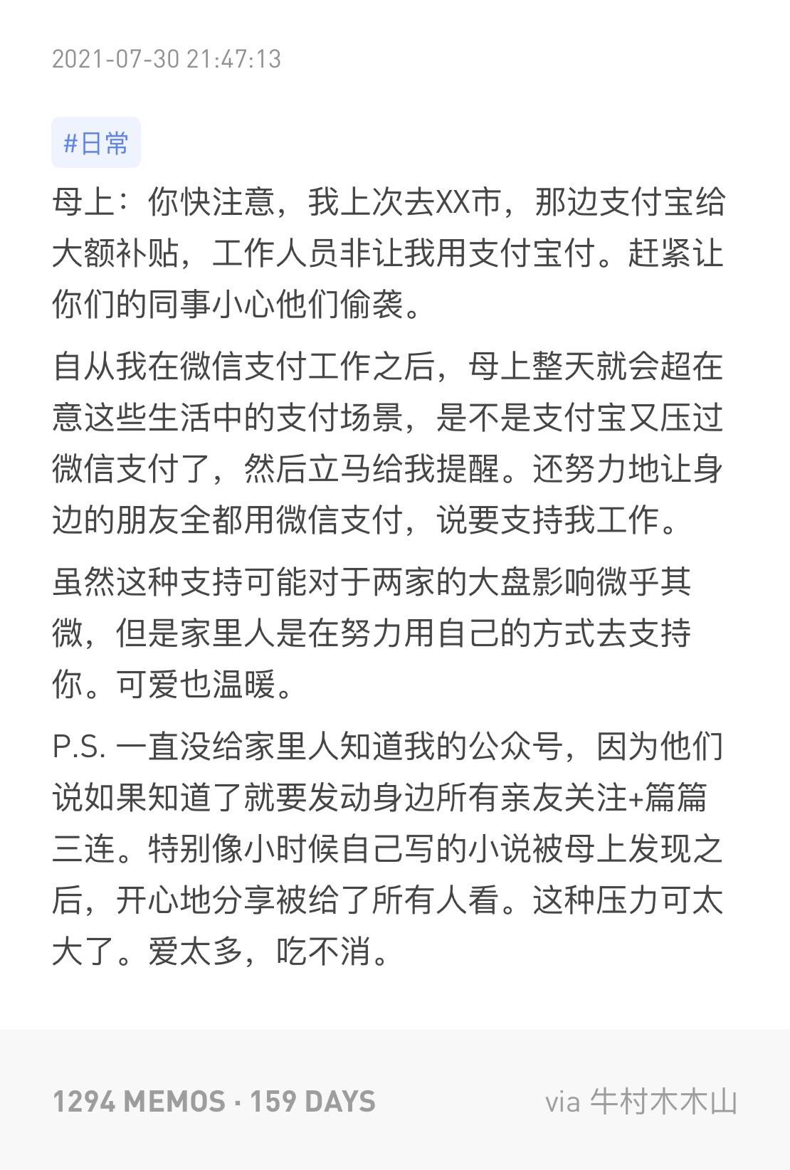 自从我在微信支付工作之后,母上整天就会超在意这些生活中的支付场景,是不是支付宝又压过微信支付了,然后立马给我提醒。还努力地让身边的朋友全都用微信支付,说要支持我工作。