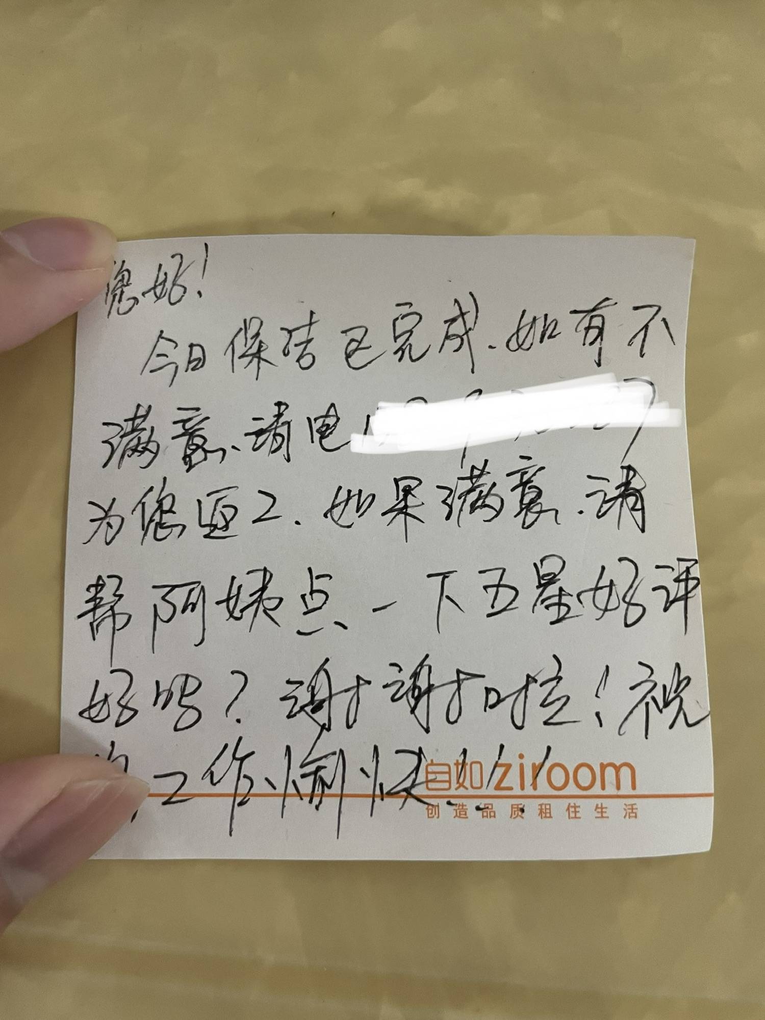 之前的阿姨都是发短信或者打电话问能否给个好评,虽然能理解,但是还是会觉得有点点被打扰。“小纸条”这种形式觉得还挺可爱和克制的。尤其想了想自己似乎很久都没有接触到手写的内容(除了签名),莫名还觉得很有诚意。