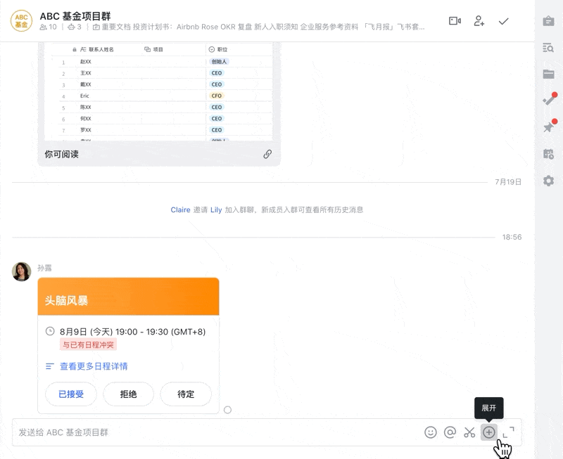 飞书“文档权限与群打通”的功能应运而生。当你把一个飞书文档发到飞书群,群成员可以自动获取阅读权限,你也可以在群里给他们开编辑权限;如果你不小心发错了文档,把消息撤回后,文档权限也会一并撤回,便捷又安全。Media