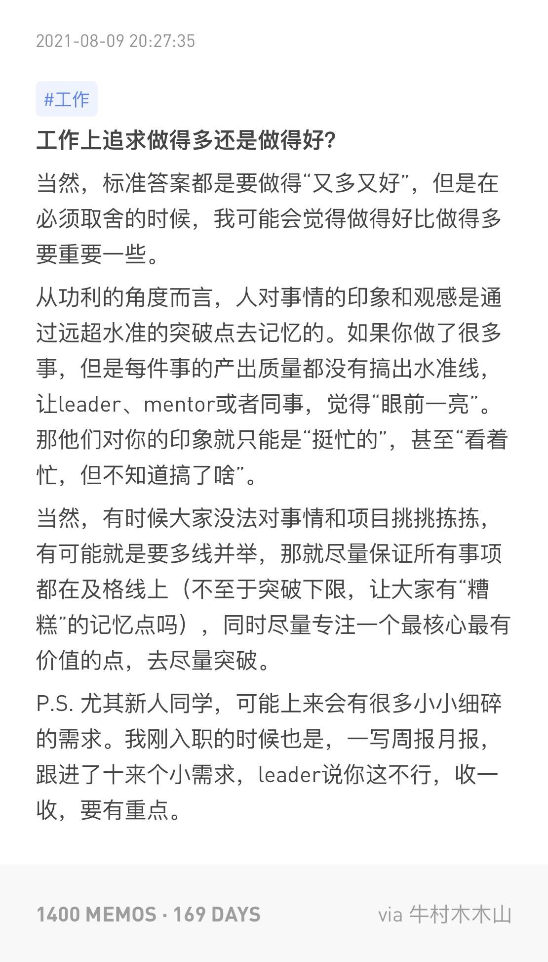 当然,标准答案都是要做得“又多又好”,但是在必须取舍的时候,我可能会觉得做得好比做得多要重要一些。