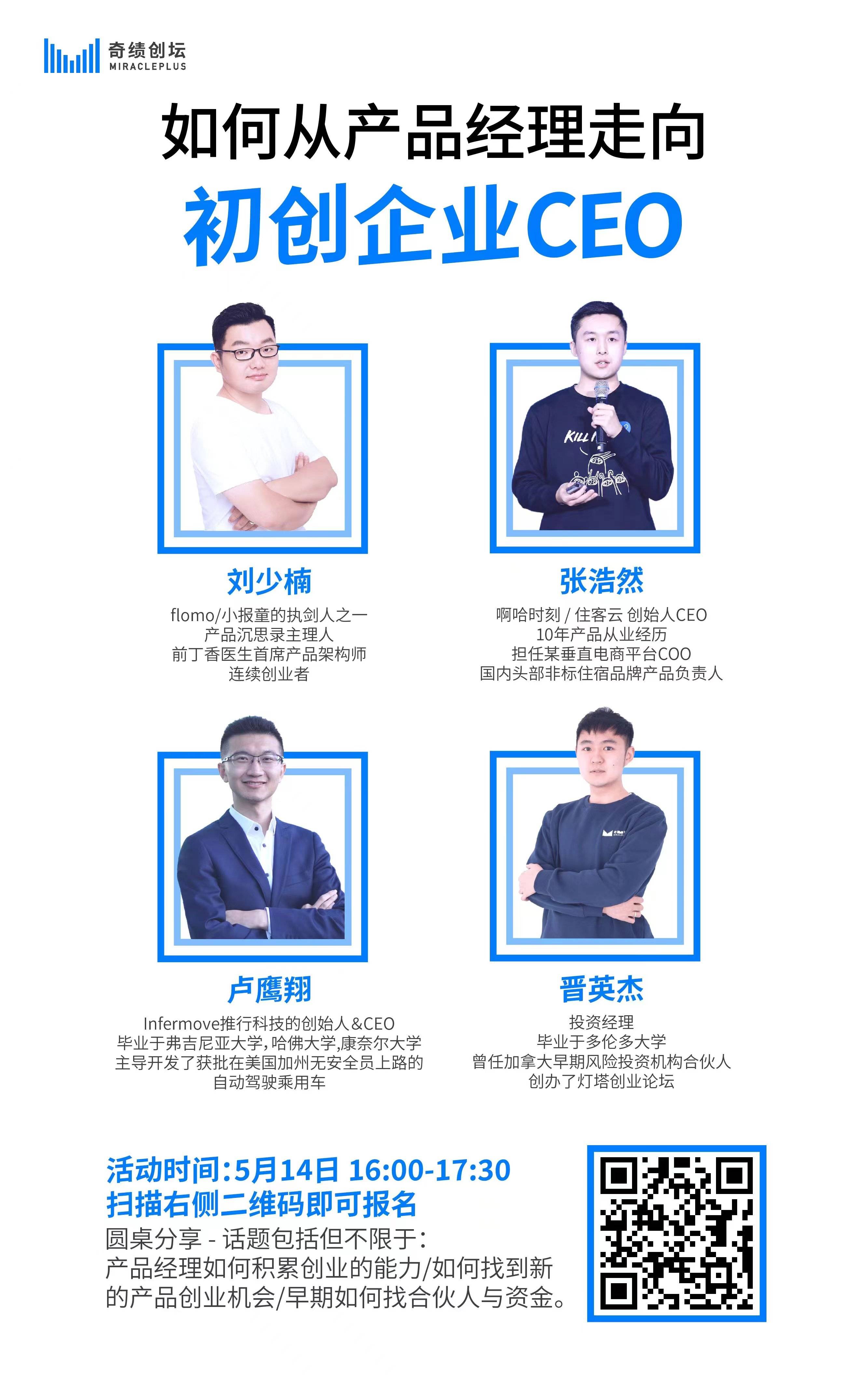 ⚠️奇绩创坛将在http://t.cn/A6XVHVPi /互联网大厂【产品经理】背景的同学举办一场圆桌直播活动。我们邀请到刘少楠,张浩然,卢鹰翔,共同分享如何从产品经理走向企业创始人&CEO,来一场产品背景创业的盛宴。欢迎扫描海报二维码/点击评论区🔗报名参加!