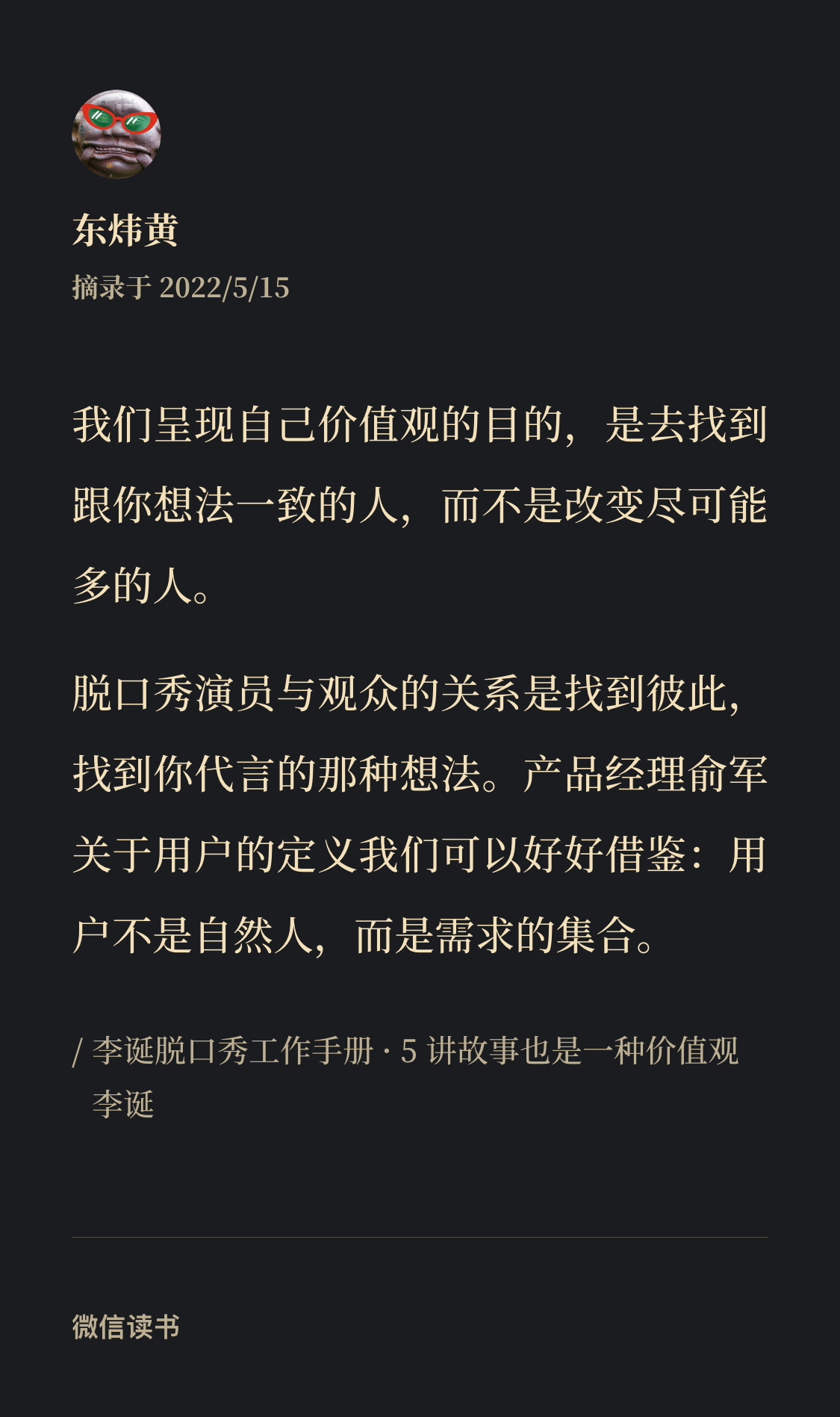 在《李诞脱口秀工作手册》里遇到《俞军产品方法论》。有种奇妙的呼应。所谓人人都是产品经理,这回我信了。