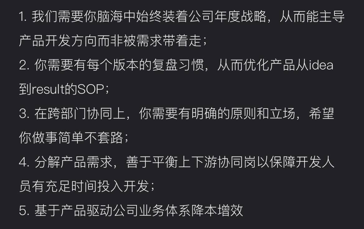 立志于成为产品总监的产品同学可以时常拿这个要求来对照下,看过不少JD,能把这个岗位的核心清晰的展示出来还是不多的。